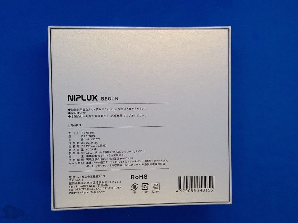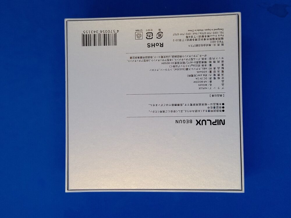▲しっかりとした段ボールにNIPLUX BEGUNが梱包されて送られてきました。但し私はモニターをさせて頂きましたので実際の梱包は違うかもしれません。